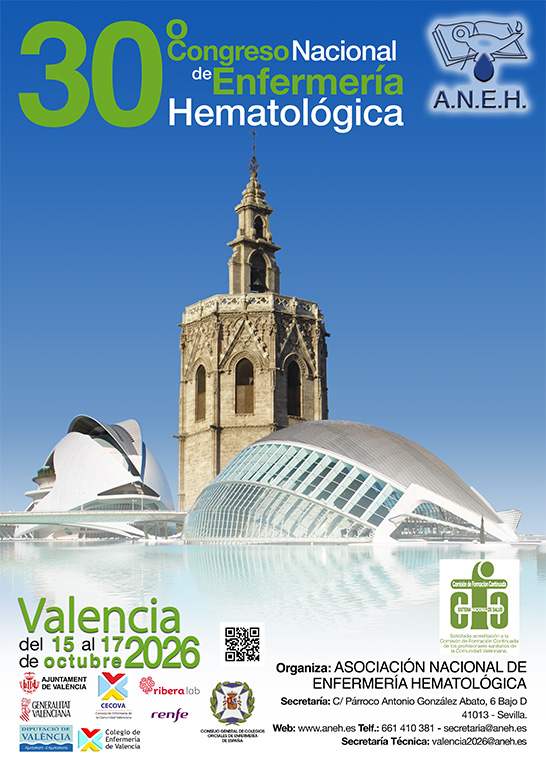 El 30º CONGRESO NACIONAL DE ENFERMERIA HEMATOLOGICA que se celebrará en Valencia los días 15, 16 y 17 de octubre de 2026.